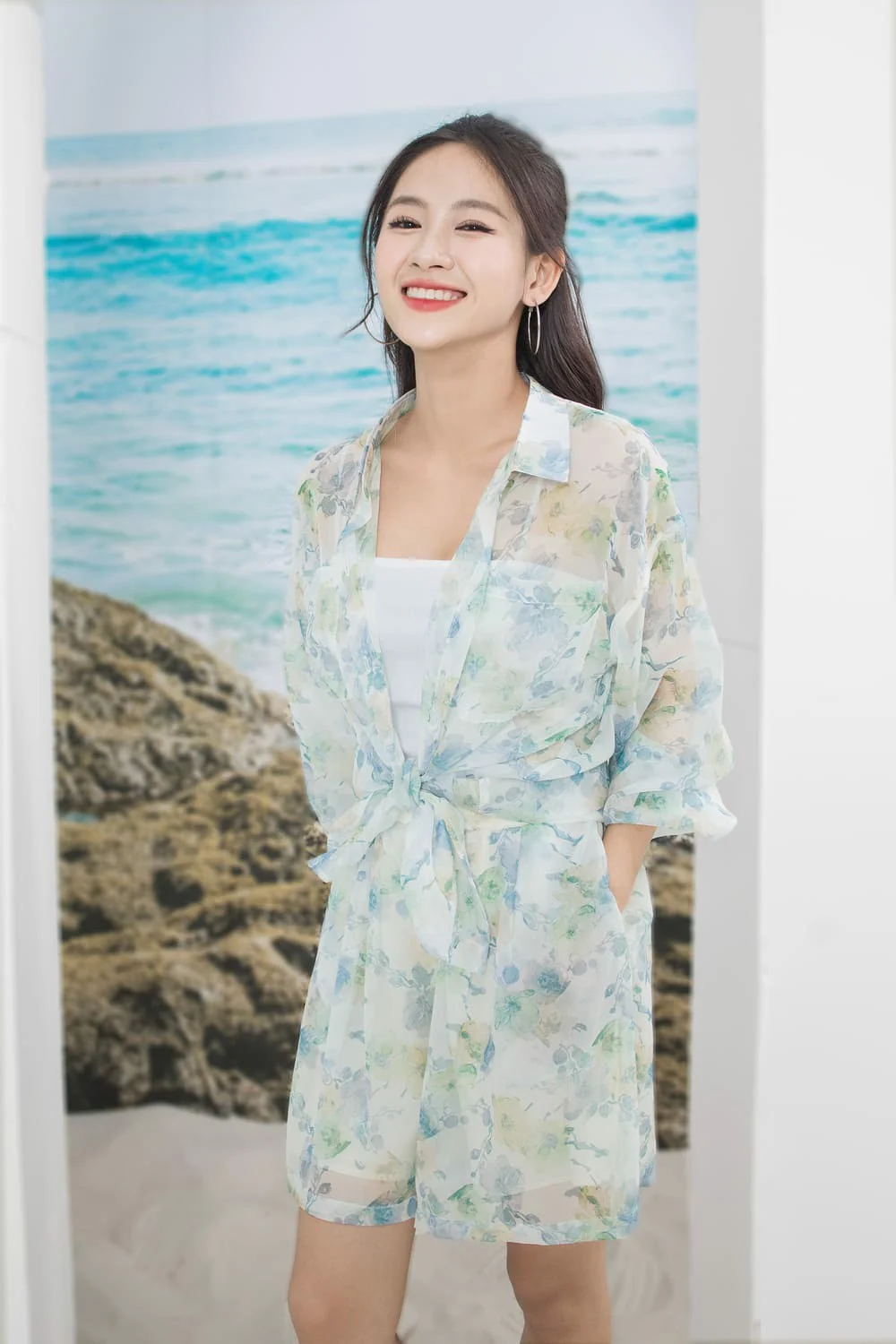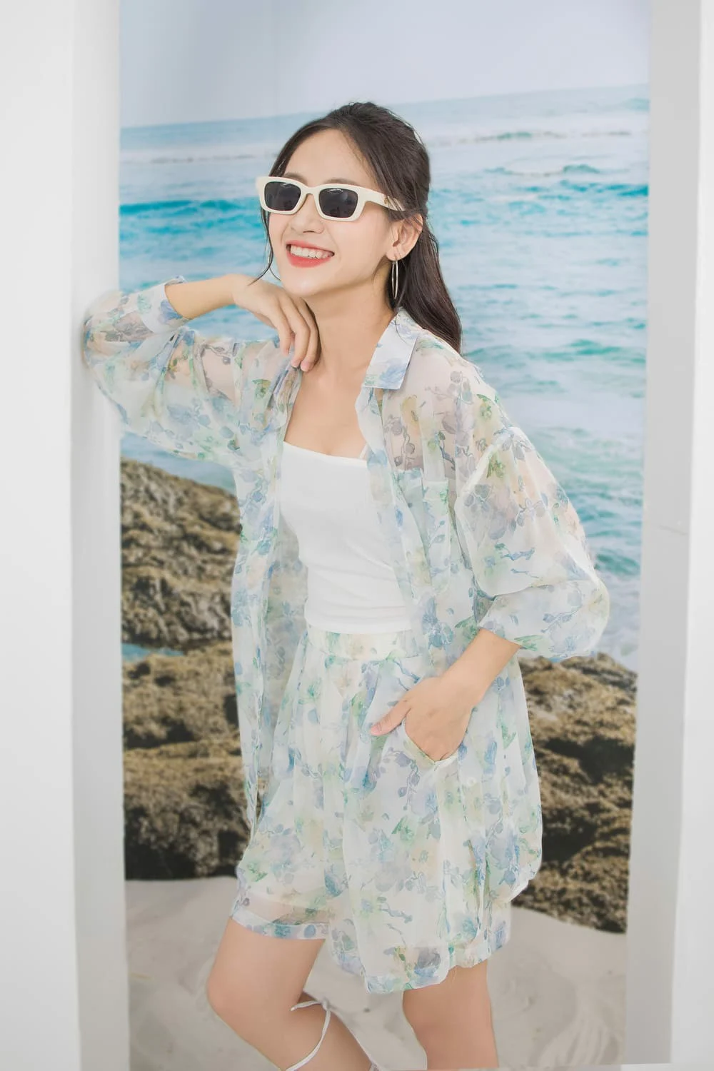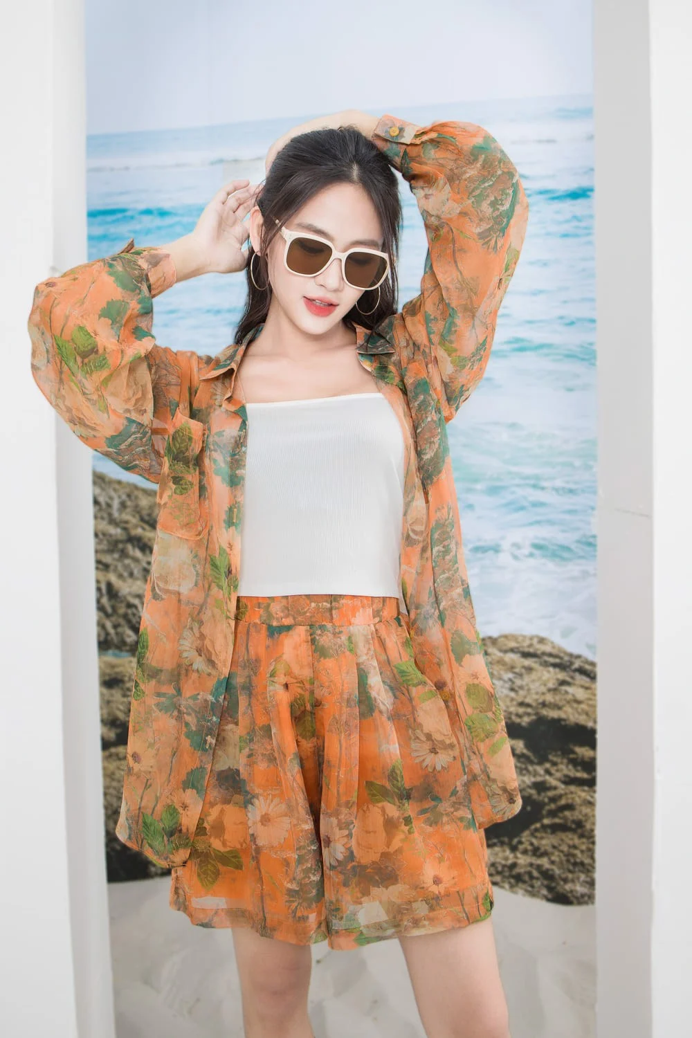 Set tơ hoa sơ mi quần đùi thoáng mát – Tặng kèm áo 2 dây tăm lạnh